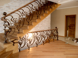 Определение маршевых лестниц звучит так: Лестницы, состоящие из нескольких прямых участков, которые соединены поворотными площадками, или же разворотом, имеющим веерное расположение ступеней. Лестницы из одного прямого участка тоже называют маршевыми. При веерном расположении ступенек, можно одновременно сделать и разворот, и на нём набирать высоту. Из выше изложенного следует, что поворотная площадка является одной ступенью, а при веерном развороте на её месте можно сделать несколько ступеней. Такое расположение поворотных площадок позволяет сделать основные марши с меньшим наклоном и вписать в такие проёмы, где лестница имеющая прямые площадки не вмещается. Цельная металлическая балка, являющаяся основой маршевой лестницы, называется косоуром. Наличие одной или двух несущих балок зависит от ширины лестницы. Если это узкая лестница, то косоур изготавливается из одинарной балки и собирается из отдельных элементов, сваренных между собой. Это предоставляет возможность производства лестниц необычной геометрической формы. Часто встречается консольный тип лестниц. Это ступени, один край которых прикреплён к капитальной стене, второй остаётся висеть в воздухе. При этом используются ступени с толщиной металла от 60мм. Лестница, свёрнутая по спирали, которая напоминает змейку, повторяющую геометрическую линию криволинейной стены, называется хребтовой. Она состоит из отдельных элементов, которые соединяются методом последовательной вставки один в другой. Такая лестница напоминает собой лестницы, на сложной сварной конструкции косоура, которые описаны выше. Но отличается тем, что элементы лестницы держатся друг за друга за счёт конструкции, а не свариваются друг с другом. Это дает особые преимущества, потому что можно повернуть каждый отдельный элемент лестницы относительно другого элемента. Чаще всего мы можем увидеть двухмаршевую лестницу. При этом на каждом этаже располагается одна промежуточная площадка и обычно два одинаковых марша. Реже встречается трёхмаршевая лестница, сверху напоминающая букву «з». Она состоит из двух промежуточных площадок, чаще квадратной формы, соединённых между собой тремя маршами (при этом верхний и нижний равны, а средний более короткий). Следует отметить особый вид лестниц – это распашные лестницы, которые чаще всего применяются как парадные. Такие лестницы смотрятся величественно, при этом требуя больших площадей. Состоят из промежуточной площадки и трёх маршей: нижнего и двух верхних, которые распахиваются в правую и левую стороны. Материалы, применяемые для изготовления лестниц.Прежде всего, следует отметить, что для изготовления лестниц используется не только дерево. Для этой цели также применяют гранит, бетон, мрамор, стекло, металл, а так же их всевозможные комбинации. Для приготовления наклонных лестниц с помощью косоуров, применяются такие материалы как бук, ясень, дуб, сосна. Но далеко не всякое дерево подойдет для этой цели, следует использовать только идеально высушенное дерево, только тогда ступени не будут прогибаться, и в них не будет щелей. Лестницы выполненные на косоурах бывают не только деревянные, существует масса других вариантов. Примером может служить: косоур - деревянный, перила кованные, а ступени облицованные мрамором, или же косоур может быть изготовлен 